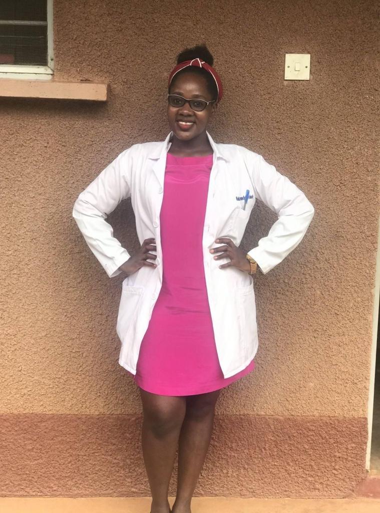 In a lab coat is Dr Robinah at the hospital